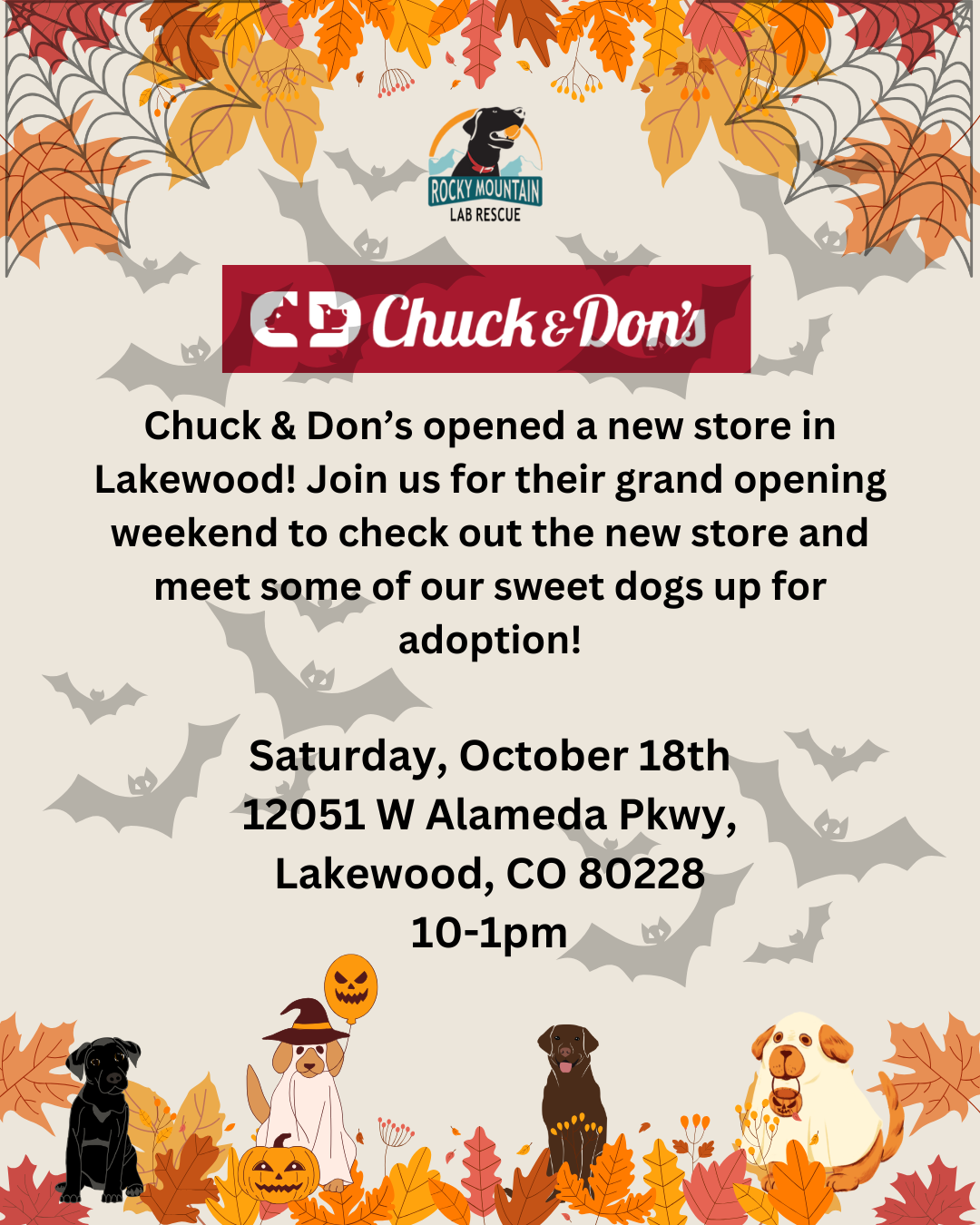 Shop for treats and and meet a few of our sweet adoptable dogs! Saturday, October 18 10-1pm Chuck & Don's - Lakewood 12051 W Alameda Pkwy, Lakewood, CO 80228